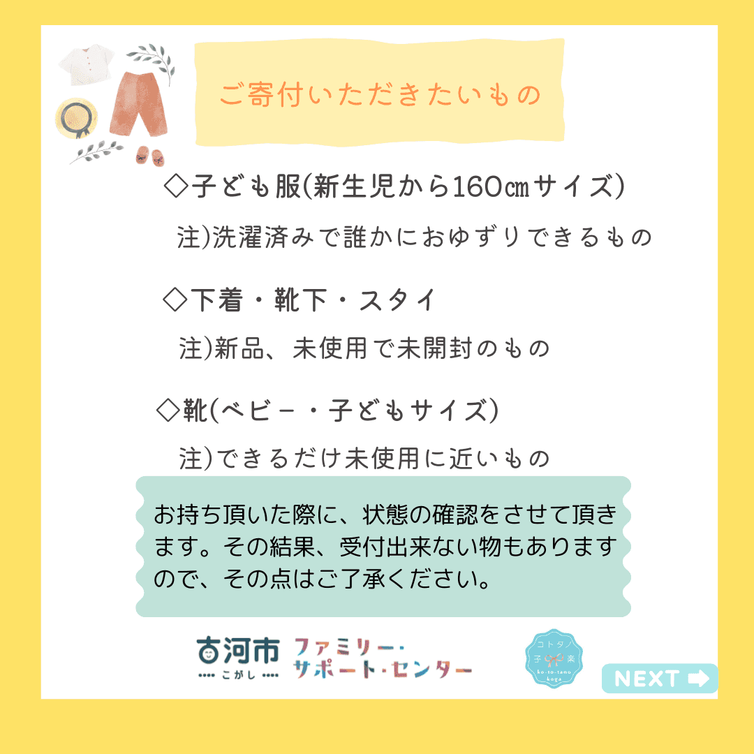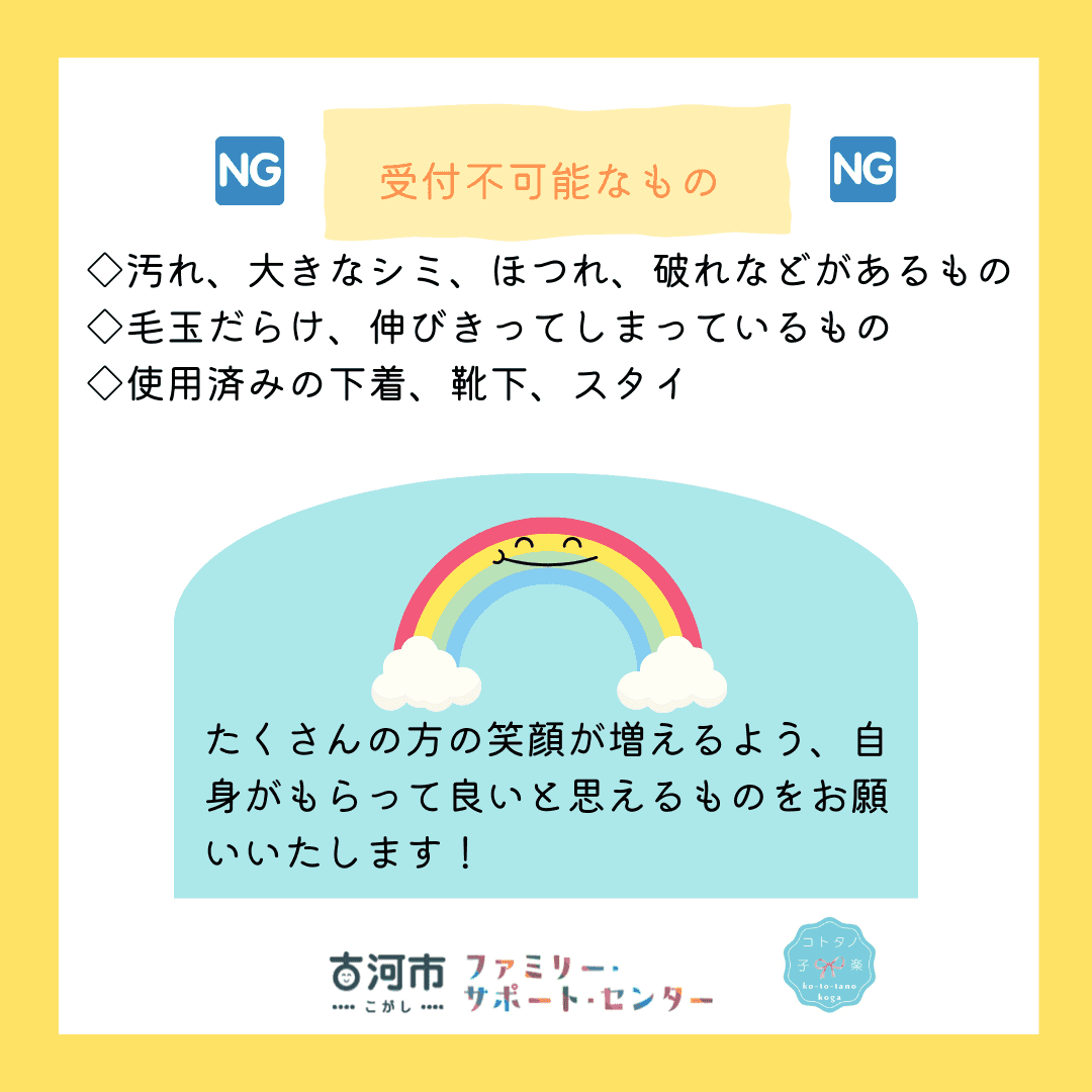 寄付していただくにあたり、受付出来ないものもありますので、画像にあります詳細のご確認をしていただきご持参していただけますと助かります。